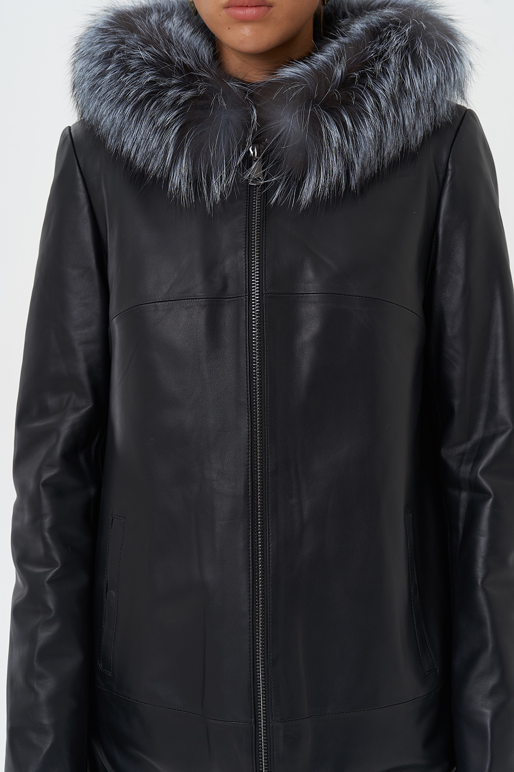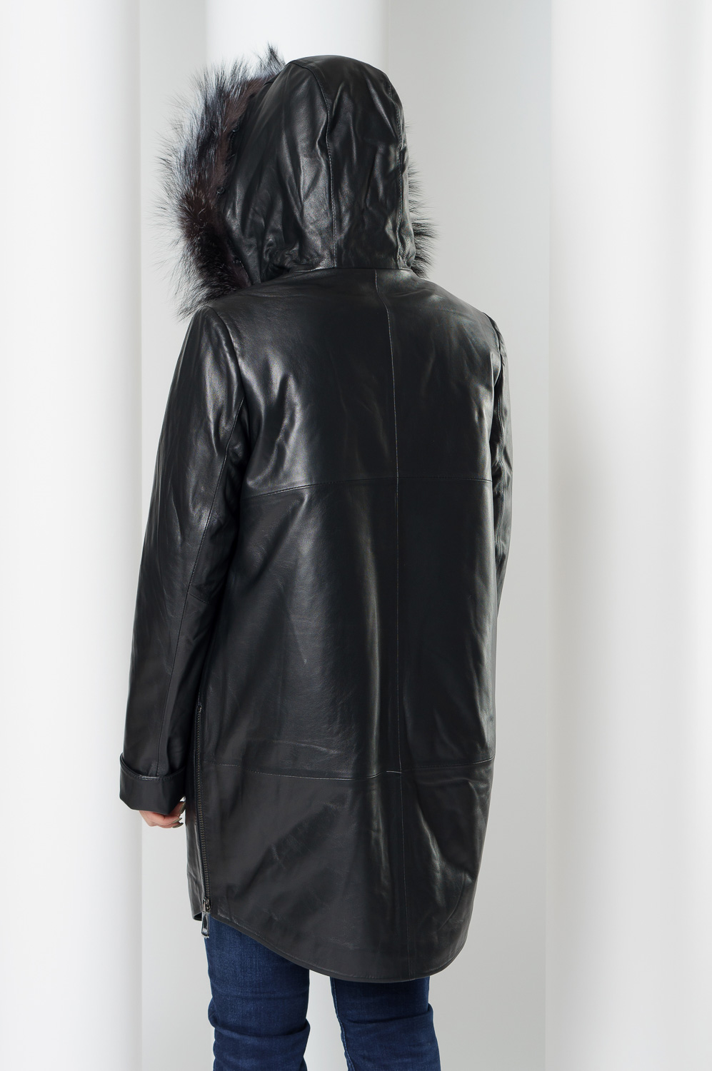 Утепленное пальто из натуральной кожи украсит ваши дождливые будни. Капюшон с отделкой из меха чернобурки согреет в ветреную погоду. Удобный фасон позволит совершать длинные прогулки. Утеплитель обеспечит комфортное пребывание на улице. С помощью молний по бокам изделия вы можете отрегулировать низ модели.